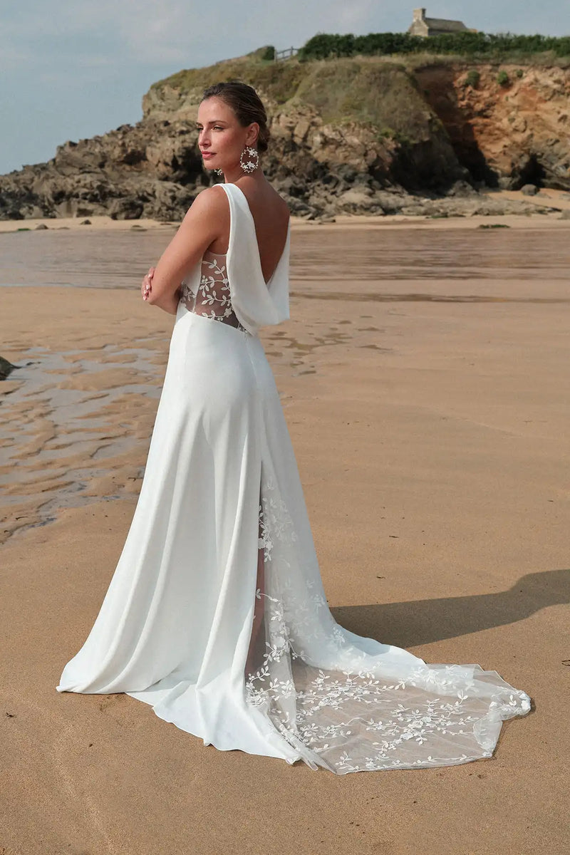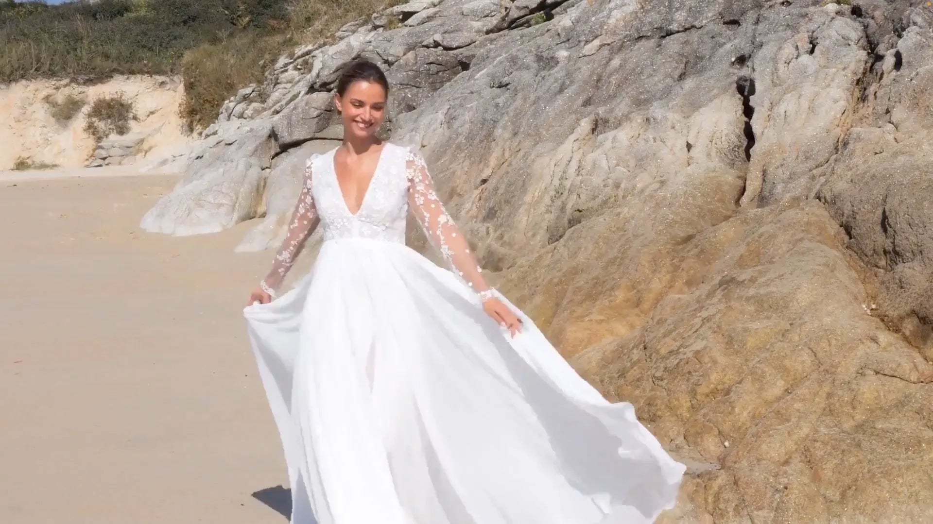 Marie Laporte nous plonge dans un bain de lumière où le soleil couchant dépose sur l’eau un léger voile d’or. Chaque création évoque un souffle doux, les étoffes légères, emportées par le vent, caressent le rivage. Pieds nus sur le sable doré, romantique et moderne à la fois, la mariée danse dans la lumière du soir, libre devant l’immensité.